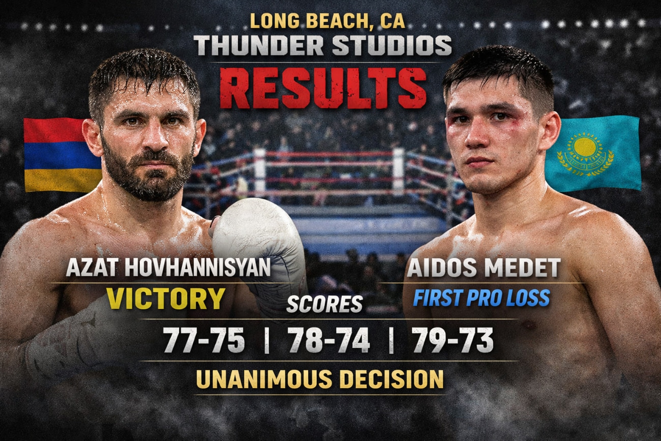 Azat Hovhannisyan took a fight on seven days’ notice Friday night and handed Aidos Medet his first professional loss, winning an eight round unanimous decision at Thunder Studios in Long Beach. The judges scored it 77-75, 78-74, and 79-73 for the 37 year old Armenian, who had been preparing as Medet’s sparring partner before the original opponent withdrew.